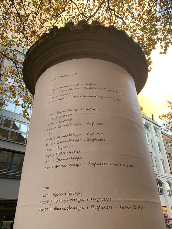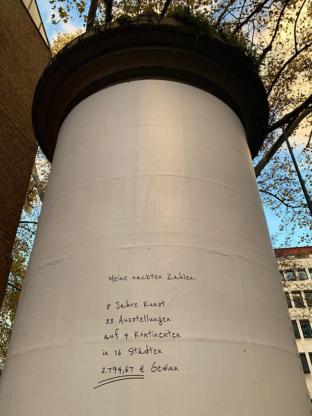 Seit Anfang November 2020 ist auf den Litfaßsäulen das Projekt „Meine nackten Zahlen“ von Dawid Liftinger plakatiert. Liftinger wirft darin einen nüchternen Blick auf seine eigene Ausstellungstätigkeit seit Beginn seiner künstlerischen Laufbahn, insbesondere die dazugehörigen Honorare, und thematisiert damit auf lakonisch-pointierte Weise eine ganz existenzielle und fundamentale Bedingung künstlerischen Schaffens, nämlich die Notwendigkeit einer angemessenen Vergütung von Künstler*innen für die Nutzung ihrer Werke in Ausstellungen. Dawid Liftinger listet sachlich auf, wie viel er „in 8 Jahren Kunst mit 34 Ausstellungen auf 4 Kontinenten in 14 verschiedenen Städten“ verdient hat. Und das Fazit, das handschriftlich schwarz auf weiß auf den Litfaßsäulen gezogen wird, ist ernüchternd. Unterm Strich, so lässt sich auf den Säulen eindrücklich nachvollziehen, zahlt sich Kunst und Kultur für Kulturschaffende nicht aus. Nur 5% der bildenden Künstler*innen in Deutschland können von ihrer Kunst leben.