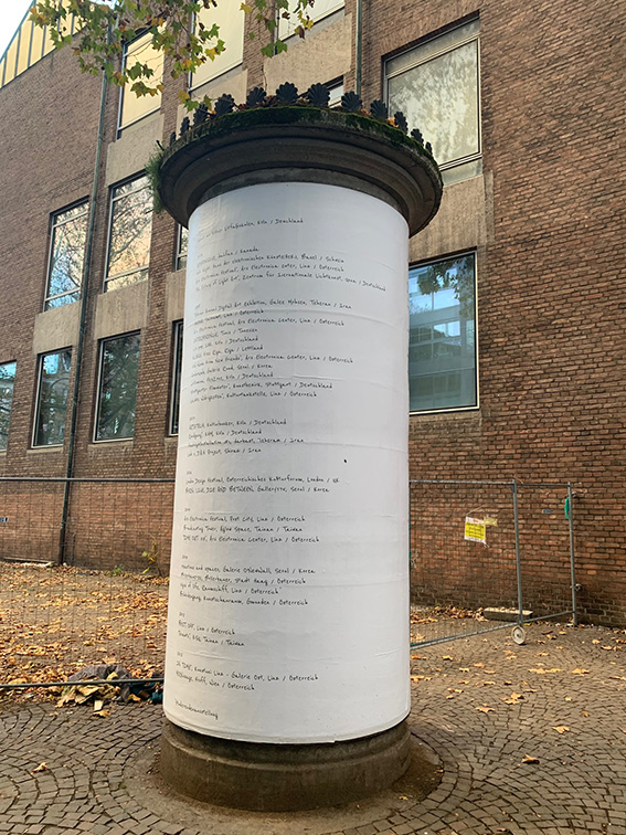Im Rahmen des seit März 2019 laufenden Projekts "Kunst an Kölner Litfaßsäulen" der Stadt Köln sind auf 25 ausgemusterten Werbesäulen im gesamten Kölner Stadtraum im zweimonatigen Wechsel eigens für die Säulen konzipierte Kunstprojekte zu sehen.