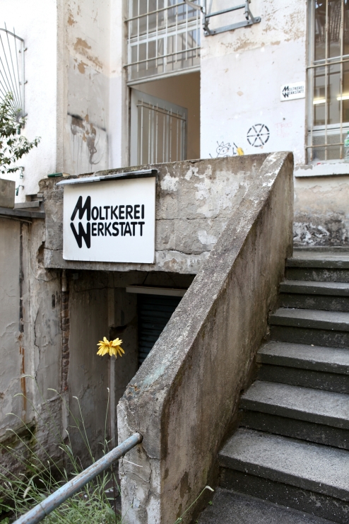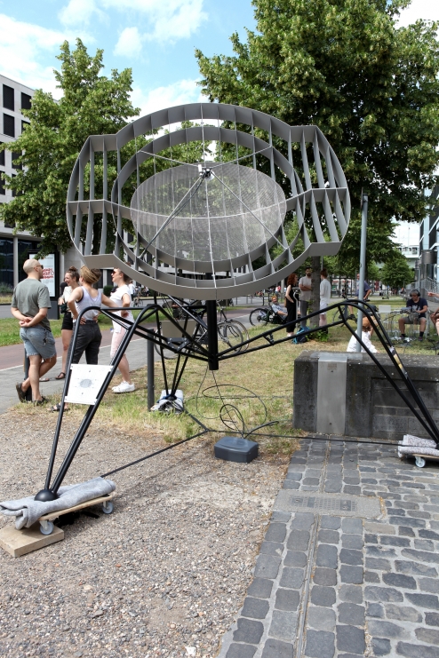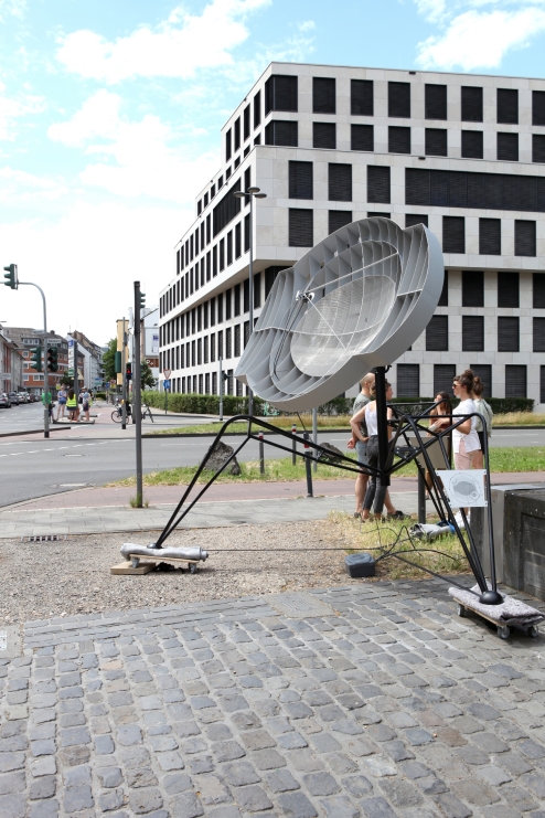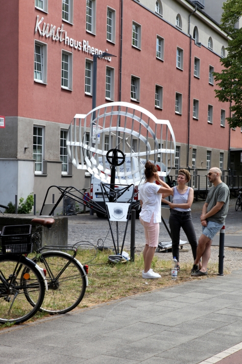 Der ~> Outer Space Transmitter, ein von der Künstlerin Mona Schulzek konzipierter Apparat zum Senden von Botschaften ins All, machte auf seiner Reise durch Europa nach einem kurzen exklusiven Halt am Ebertplatz, während des AIC On Wochenendes einen weiteren Zwischenstopp in der Nachbarschaft des Kunsthafens im Rhenania.