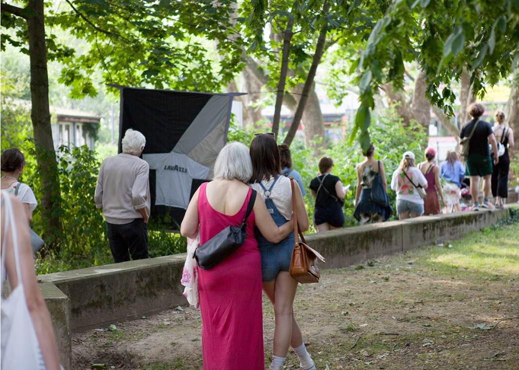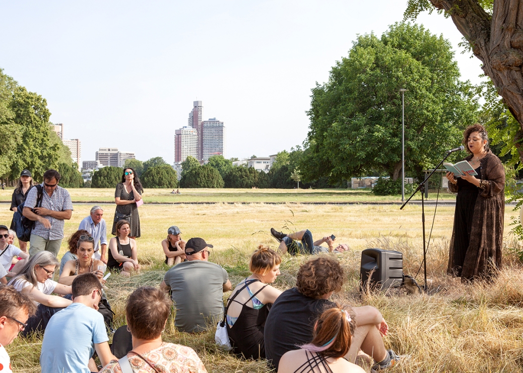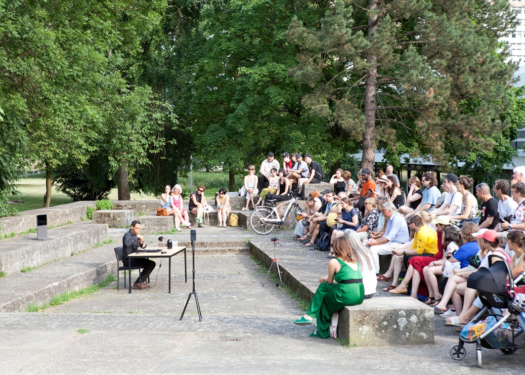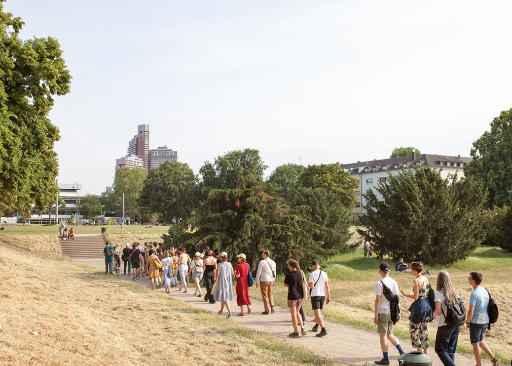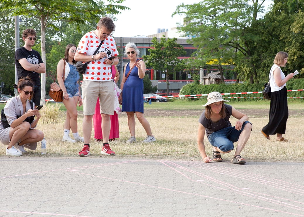 The performative walk "The So-called Outside" combines artistic contributions such as performances, readings, concerts and ephemeral exhibitions using public architecture such as platforms, terraces, flights of stairs, meadows and landscaped park areas as stages for the artistic interventions.