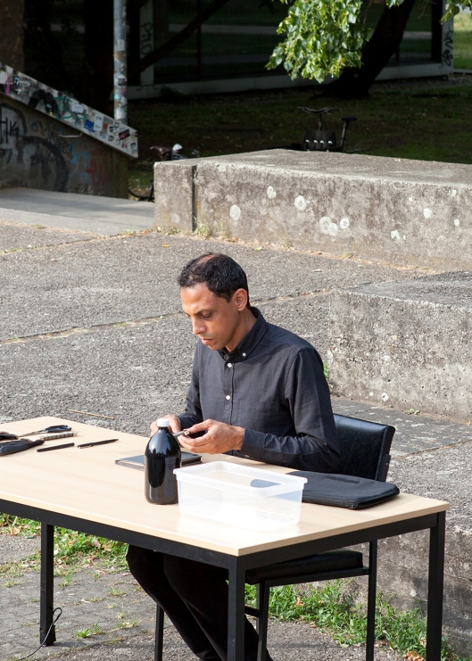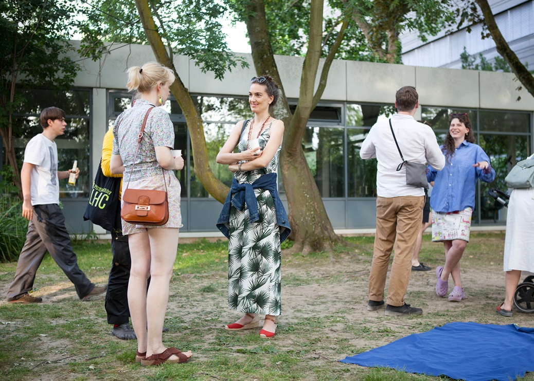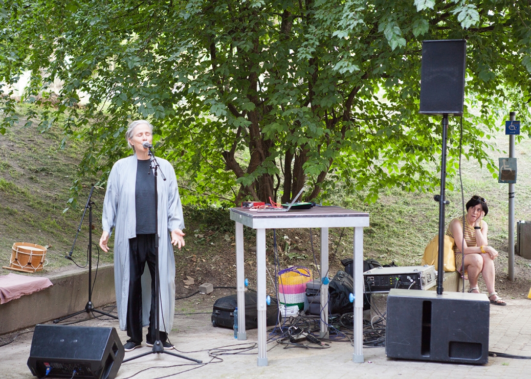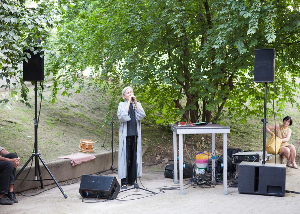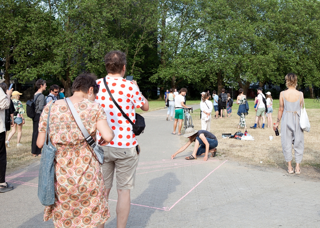 The performative walk "The So-called Outside" combines artistic contributions such as performances, readings, concerts and ephemeral exhibitions using public architecture such as platforms, terraces, flights of stairs, meadows and landscaped park areas as stages for the artistic interventions.