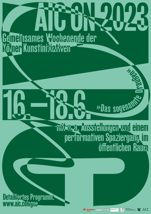 Taking place between June 16 and 18, 2023, AIC ON – the annual weekend of Cologne's art and project spaces, art initiatives and festivals – proudly presents a variety of exhibitions across the city. In addition to joint opening hours, openings and events, AIC ON invites you for a public walk with performances, a culinary intervention, concerts and readings by various artists on the "Innere Grüngürtel" (Inner Green Belt) under the title "The So-called Outside" on Saturday, June 17.