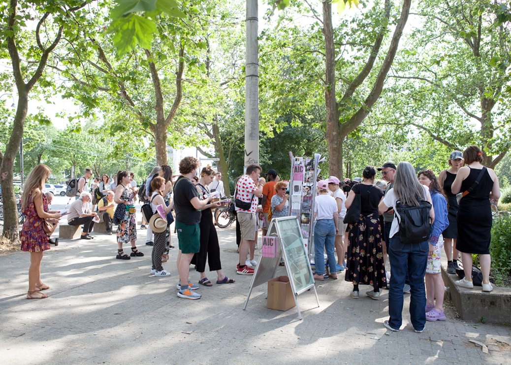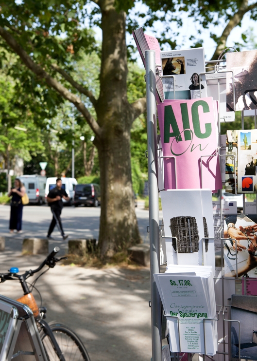 The walk takes place in a section of Cologne's Inner Green Belt motivated by the idea of a centrally located, shared space for AIC ON. Here, various artistic contributions are brought together, some of which have been selected in curatorial collaboration with AIC members as connection to the current exhibitions of the spaces. The contributions relate to the public space, respond to the corresponding locations and combine to create an experience of the so-called outside. The green belt becomes an AIC satellite and, thanks to the artistic intervention DER INFORMATIONSSTAND, at the same time a hub to all AIC venues: the artistic information stand, the public walk followed by a picnic connect the different threads from the different corners of the city.