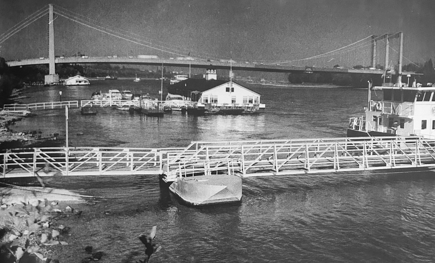 Wir stehen südlich der Rodenkirchener Brücke und werfen den Blick zurück entlang des abwärts fließenden Rheins. Die Fotografie von 1994 zeigt die Gastronomie Bootshaus Alte Liebe auf der der Abschluss unseres letzten Projektteils im September 2024 stattfand.