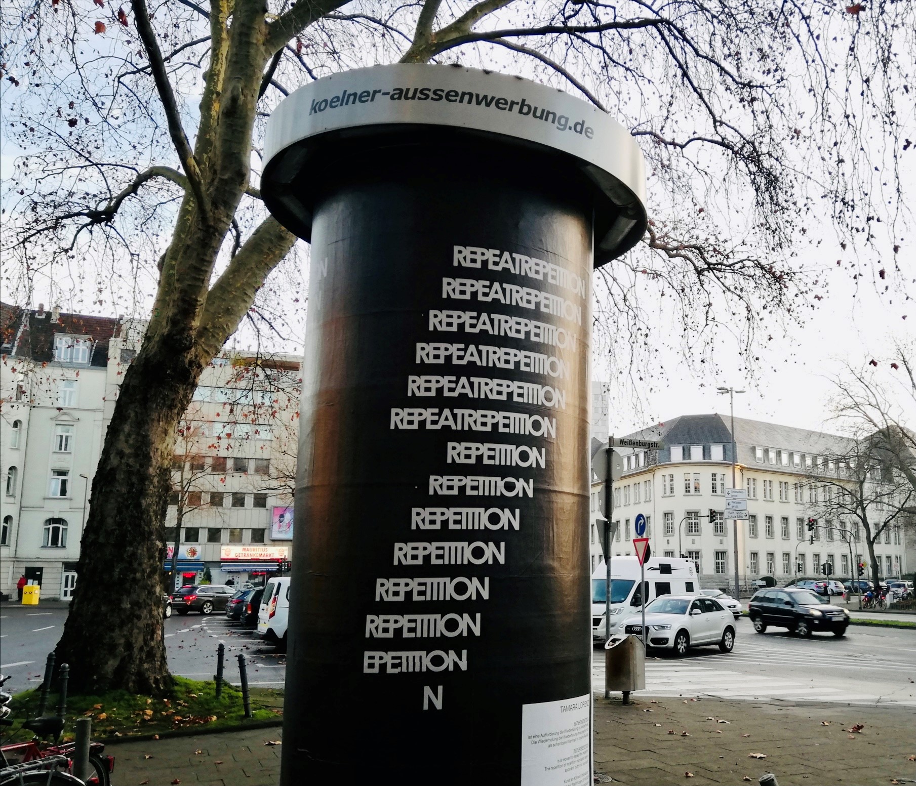 Die Kunstaktion "Kunst an Kölner Litfaßsäulen" startet in das Jahr 2021 mit "REPEATREPETITION", einem Motiv der Künstlerin Tamara Lorenz.