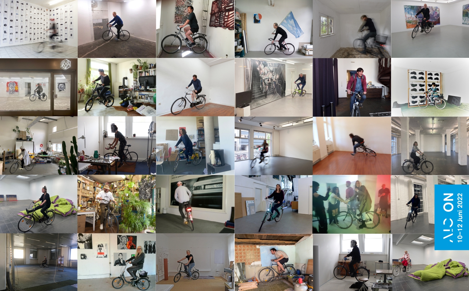 Für die Publikation Vierkanthof Bismarckstraße –– Cycling in the Studio schwangen sich im Frühjahr 2022 Künstler*innen und Kurator*innen aus Köln oder der Kölner Kunstszene nahestehend auf ihre Räder und radelten durch Ateliers, in Kunsträumen, auf Fluren und Klassenräumen der Akademien.